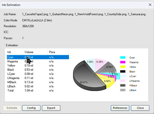 O PhotoPRINT One fornece estimativas de tinta pré-impressão que ajudam a planejar a produção, gerir os custos e reduzir a incerteza antes de os trabalhos serem impressos.
